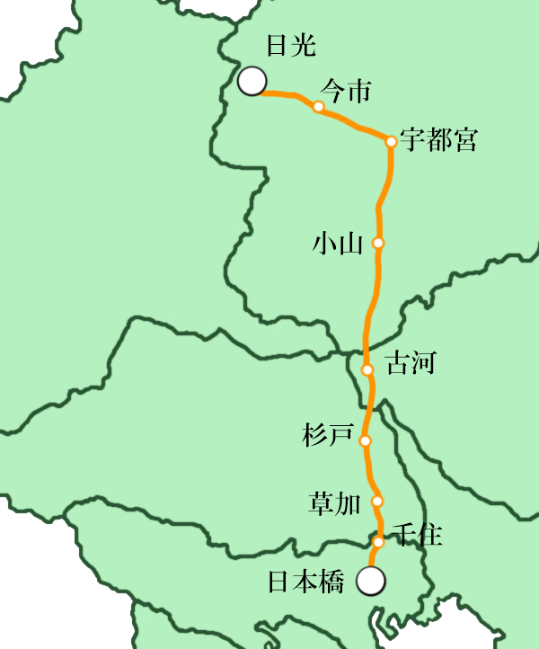 日光街道は、江戸幕府が整備した「五街道」の一つです。五街道は、江戸日本橋を起点に各地へ向かいます。日光街道は、千住・草加・越谷・粕壁・杉戸・栗橋等21の宿場を経て日光に至ります。日光は、もとは関東修験の名山と知られ、その後徳川家康の霊廟東照宮が置かれ、人々が参拝するところになりました。また、日工街道は宇都宮までの東北の諸大名が江戸への参勤交代に通る奥州街道でもありました。